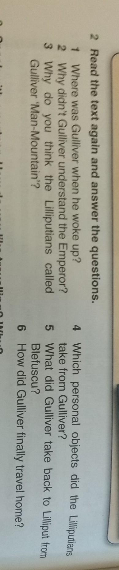 2. That day he met the Emperor. He spoke to Gulliver but Gulliver didn't understand him. They spoke different languages, so they didn't understand each other. (Then Gulliver learnt the new language and learnt that the country's name was Lilliput and the people were called Lilliputians.)