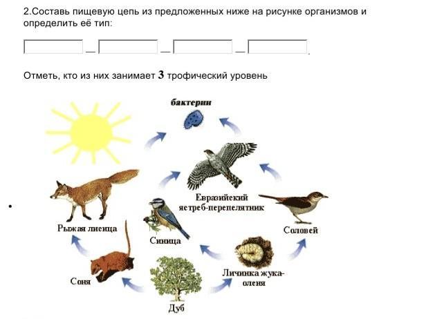 Дуб - личинка жука - синица - ястреб - бактерии.
