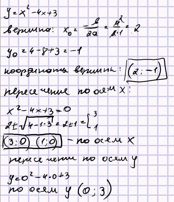 x^2-4x+3=0, корни: х=3 и х=1, координаты точек пересеч. с