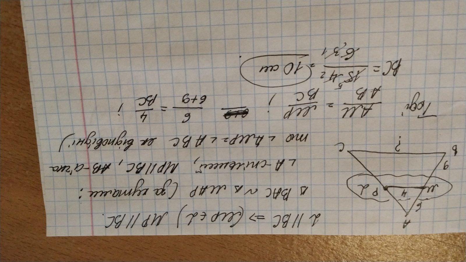 точці Р і паралельна стороні ВС. Знайдіть довжину сторони ВС, якщо АМ=6см, ВМ=9см,<br />