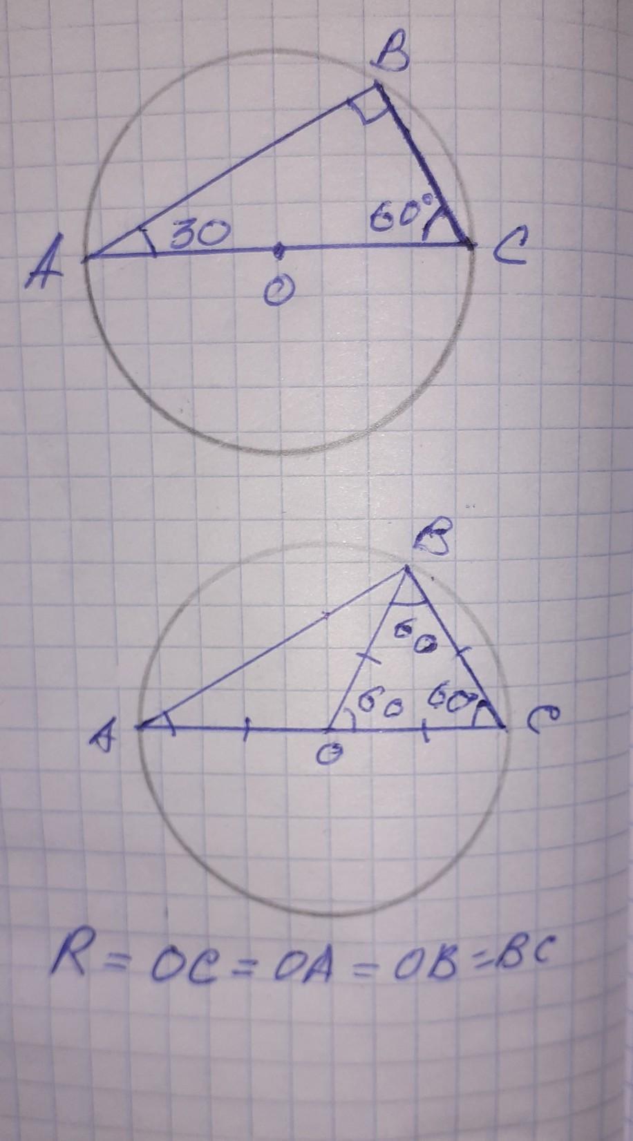 Δ ABC прямоугольный, так как у прямоугольного треугольника гипотенуза равна диаметру описанного около него окружности.