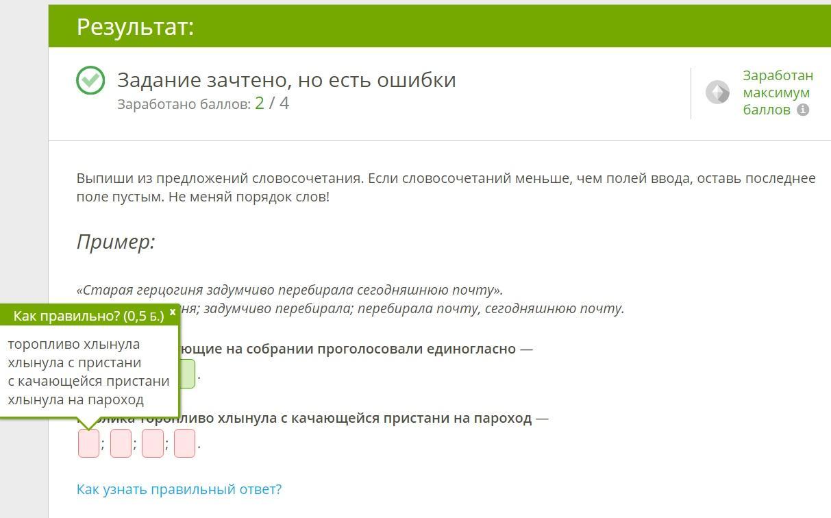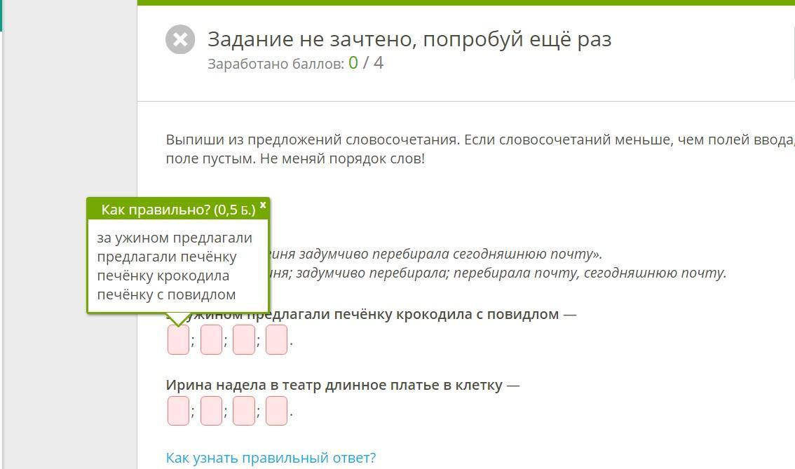 Выпиши из предложений словосочетания. Если словосочетаний меньше, чем полей ввода, оставь последнее поле пустым. Не меняй порядок слов!