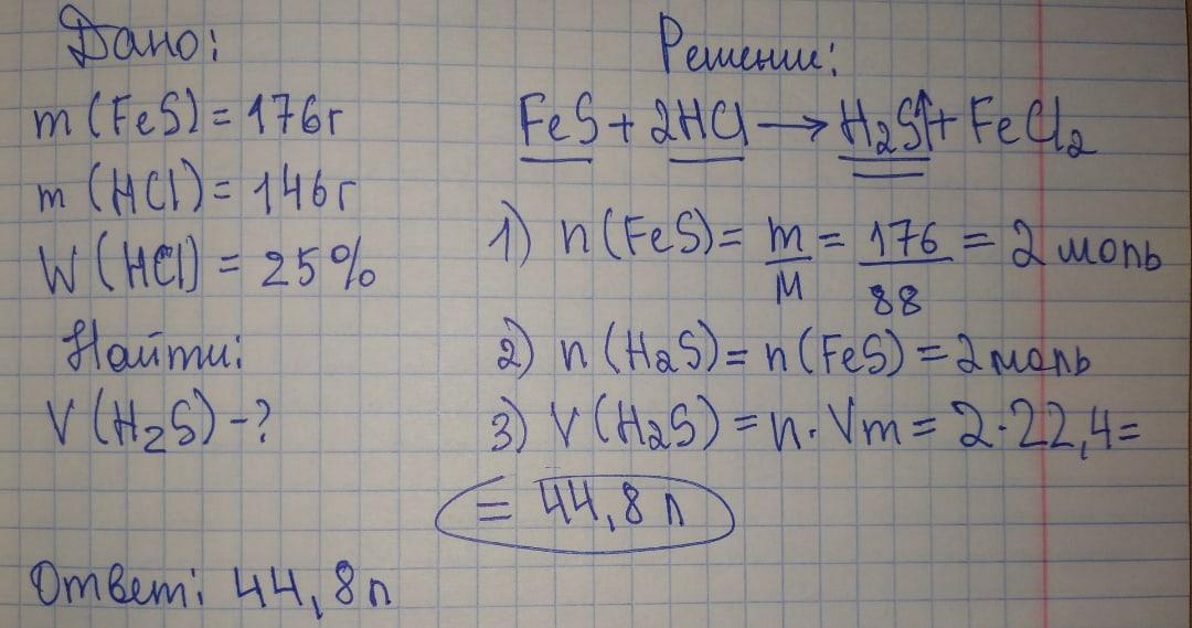 Определите объем сероводорода который выделится при взаимодействии сульфида железа(ІІ) массой 176 г с соляной кислотой массой 146 г (массовая доля HCl равна 25%).