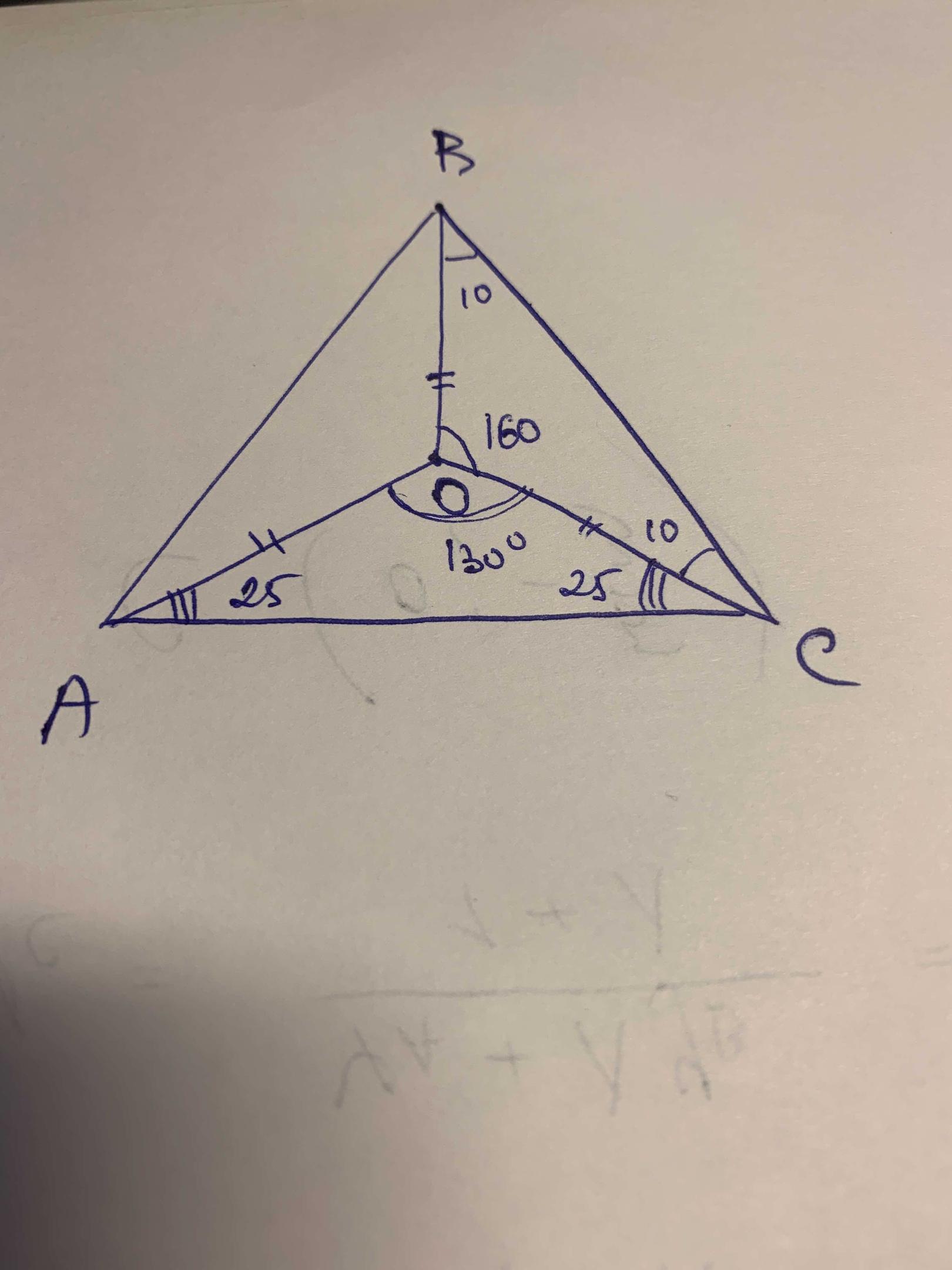 Треугольник ВОС равнобедренный по условию. Угол ОВС=ОСВ=(180-160)/2=10. Треугольник АОС тоже равнобедренный по условию. Угол ОАС=ОСА=(180-130)/2=25.