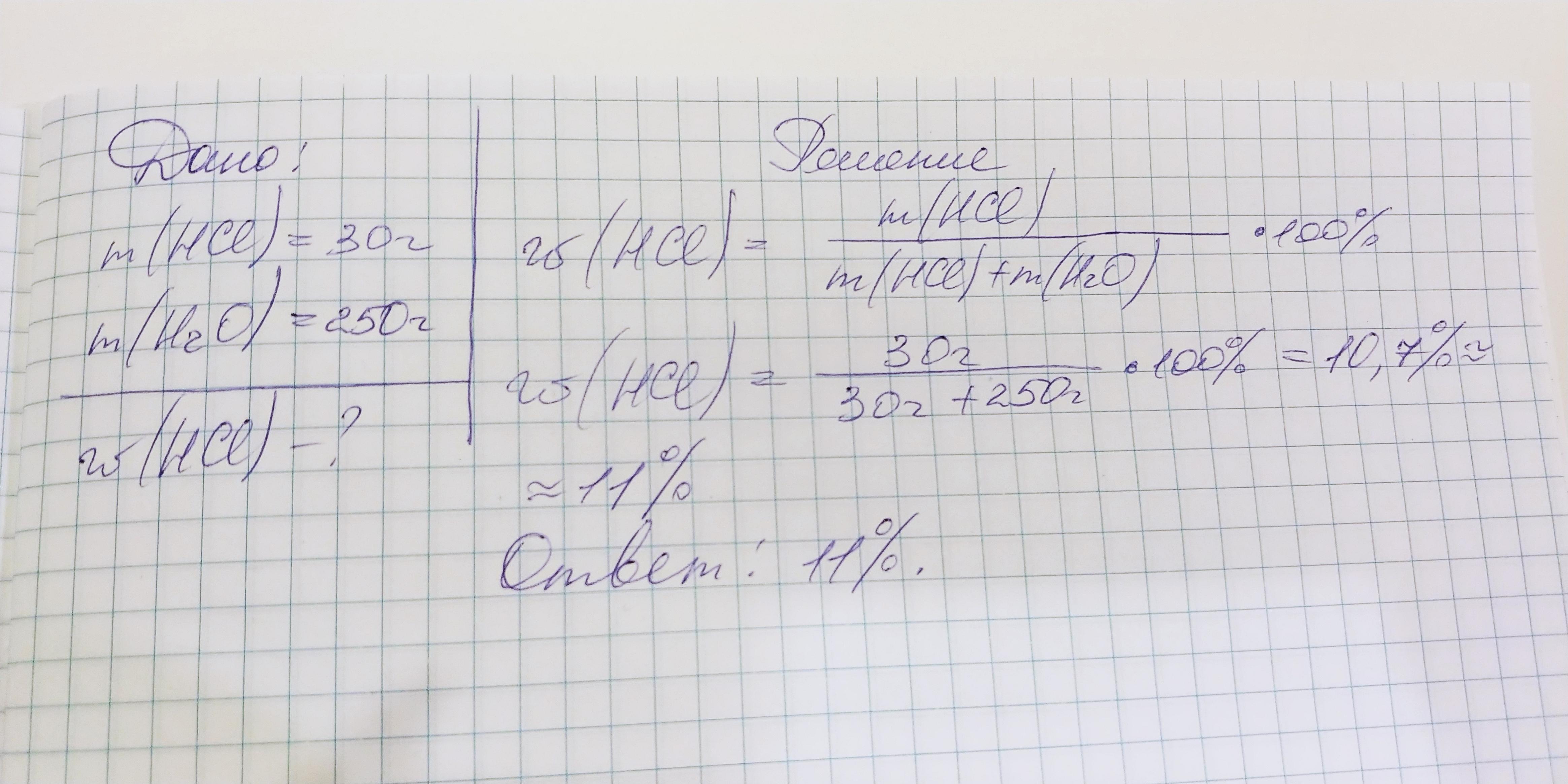 ПОМОГИТЕ ПОЖАЛУЙСТА с химией .Определить массовую долю Нсl в растворе полученном при растворении 30гхлороводорода в 250г воды.С решение .