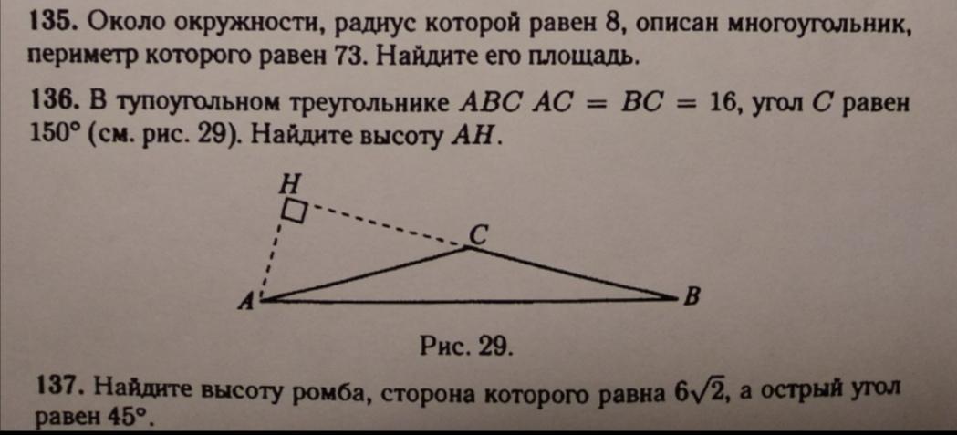 135) Многоугольник правильный , потому что окружность вписанная. Тогда площадь = 1/2* периметр * апофема= 1/2*73*8=292 . Думаю так )