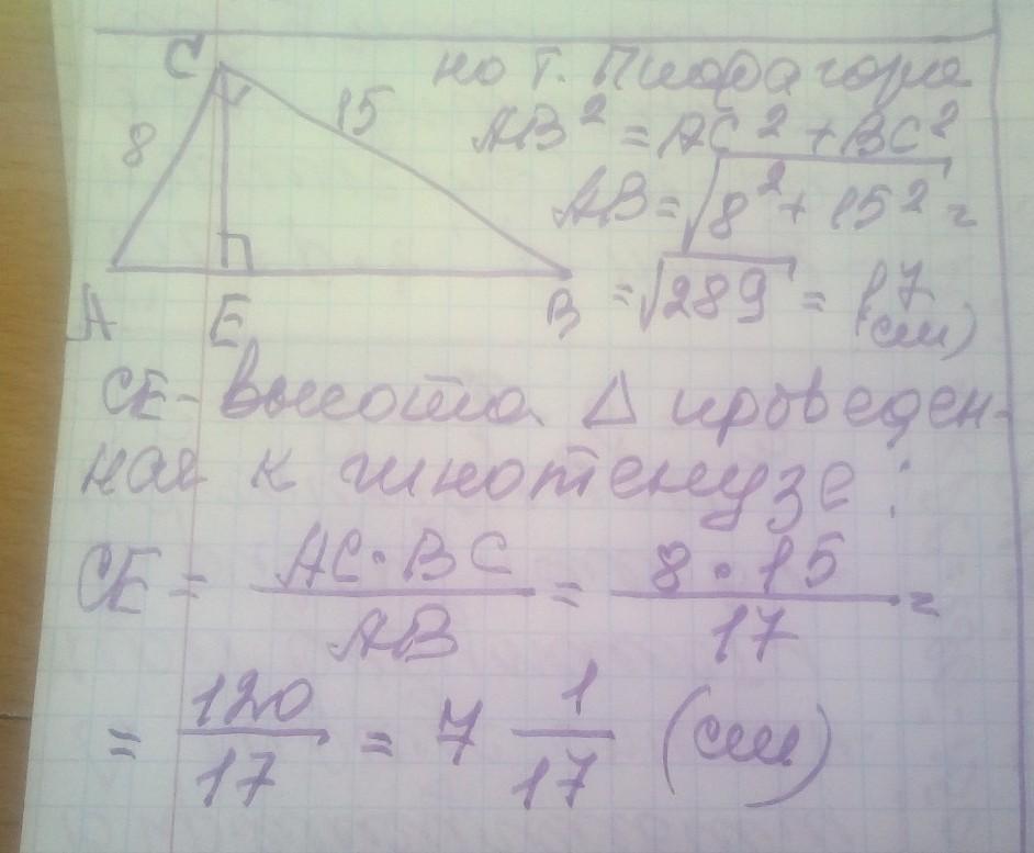 Катети прямокутного трикутника дорівнюють 8 см і 15 см.Знайдіть висоту трикутника проведену до гіпотенузи
