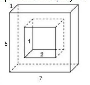 1 допустим это прямоугольный параллелепипед и тогда обьем его равен 5*7*1-1*1*2=35-2 =33