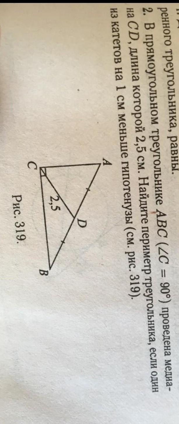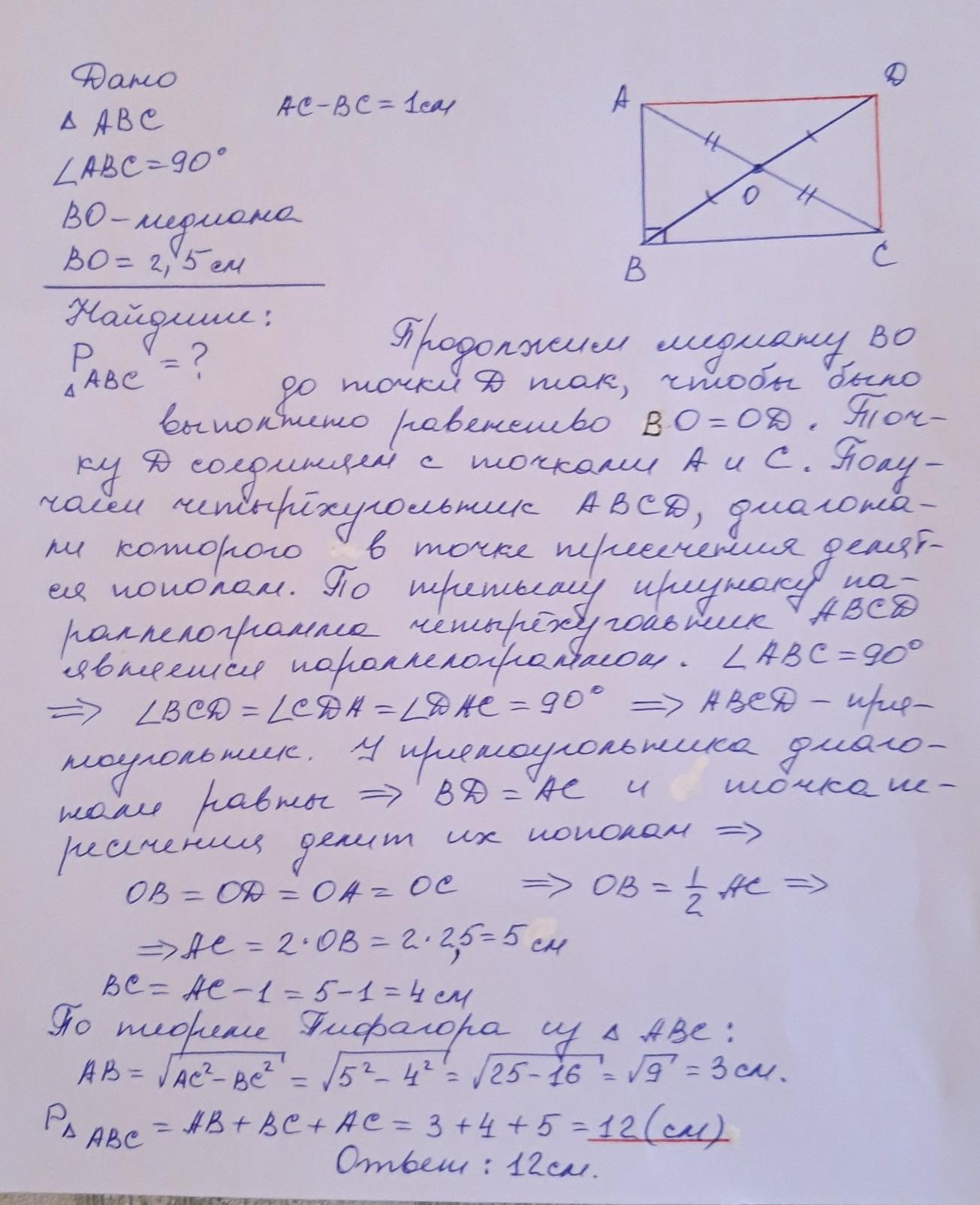 медиана прямоугольного треугольника есть радиусом описанной вокруг этого треугольника окружности, а диаметр такой окружности раден гипотенузе (это можно доказать из свойств угла, расположеного в окружности (прямой вписанный угол опирается на диаметр окружности) или как следствие теоремы, что центр описанной окружности вокруг прямоугольного треугольника лежит на середине гипотенузы)