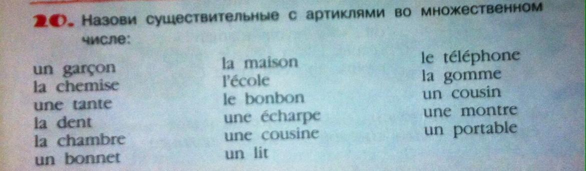 Des garçons, les chemises, des tantes, les dents, les chambres, des bonnets, les maisons, les écoles, les bonbons, des écharpes, des cousines, des lits, les téléphones, les gommes, des cousins, des montres, des portables