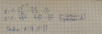 : В урне находится 15 шаров, из них 9 красных и 6 синих. Какова вероятность того, что вынутые наугад два шара: а) оба красные; б) 3 красных, 1 синий?
