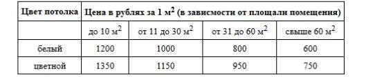 Стоимость работ по установке натяжных потолков приведена в таблице.Какова стоимость заказа, если действует сезонная скидка в 5%?