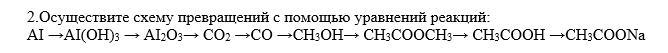 AI →AI(OH)3 → AI2O3→ СО2 →СО →СН3ОН→ СН3СООСН3→ СН3СООН →СН3СООNa