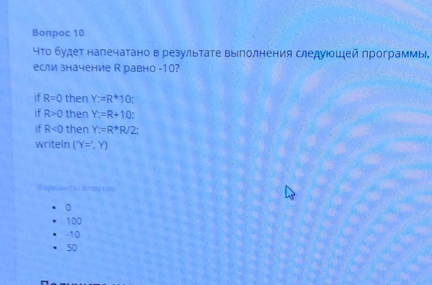 переменная R равна -10, по условиям операторов это подходит к 3 строчке кода а именно R тоесть -10 < 0 , это верно и поэтому сработает этот участок кода, из которого следует -10*-10/2 что равняется 50