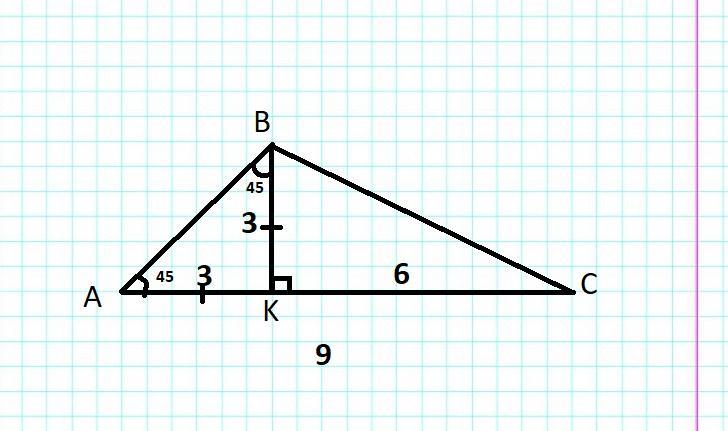 В треугольнике АВС угол А равен 45 градусов, высота ВК делит сторону АС на отрезки 6 см и 3 см, считая от вершины А. Найти площадь треугольника АВС.