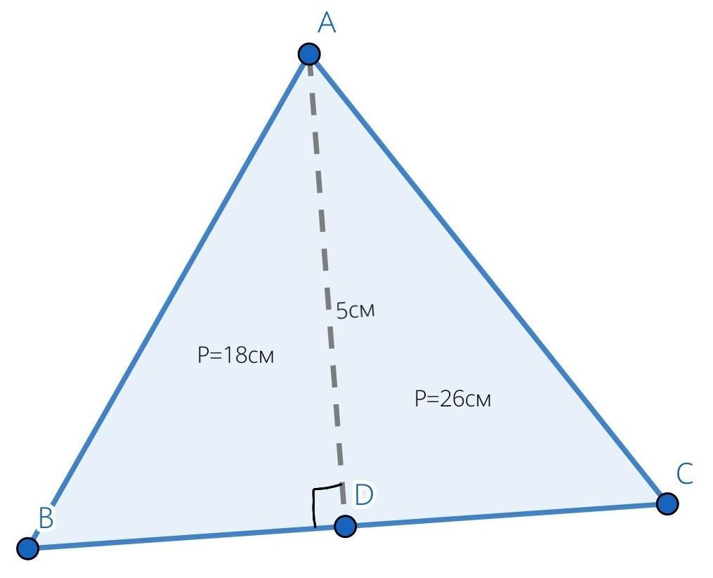 Высота треугольника длинной 5 см делит его на две треугольника с периметрами 18 см и 26 см Найдите периметр данного треугольника