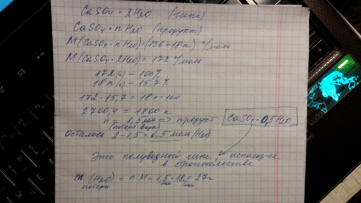 нагревание образца природного гипса при заданной температуре привело к уменьшению массы на 15,7%.Рассчитать,удалению какого количества воды из образца соответствует такая потеря массы.Записать формулу полученного соединения.указать его применение. ответ: 27г,CaSO4*0.5H2O