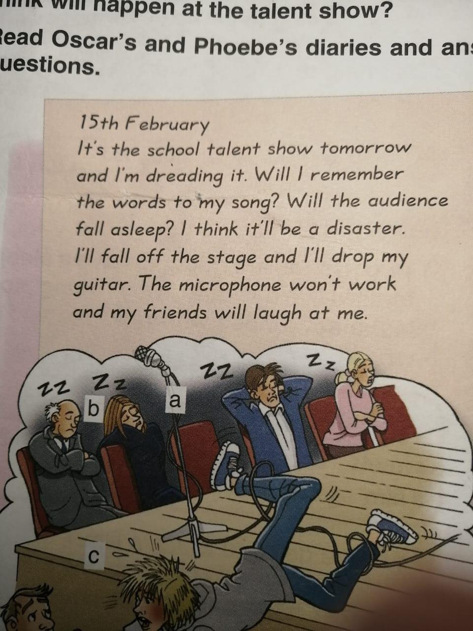 15 февраля. Завтра состоится шоу талантов в школе, и я боюсь его. Запомню ли я слова песни? Аудитория уснет? Я думаю, что это будет катастрофа. Я упаду со сцены и уроню свою гитару. Микрофон не сработает, друзья будут смеяться надо мной.