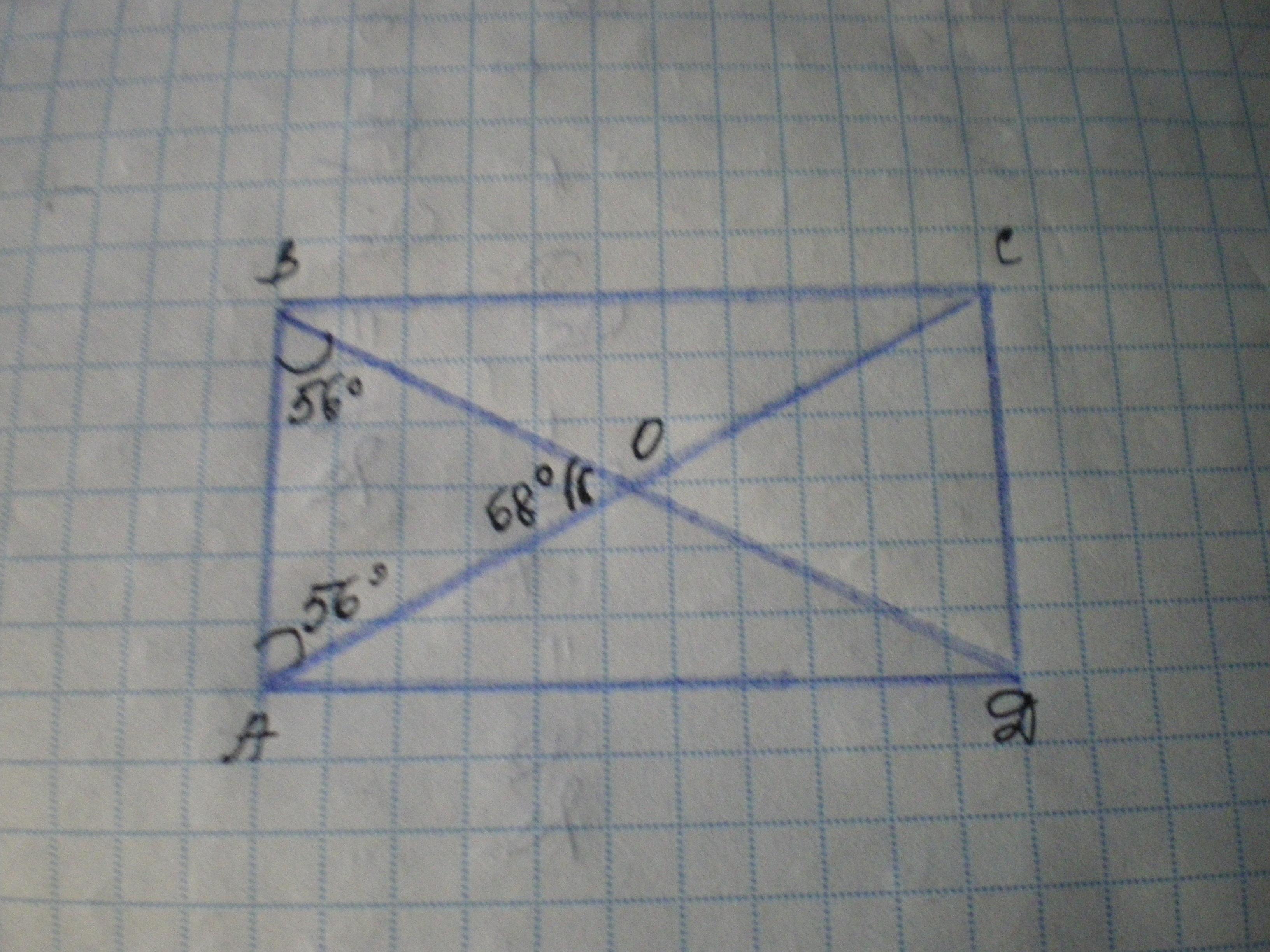 Дано: АВСD - прямокутник, АС, ВD - діагоналі, ∠ВАС=56°. Знайти ∠АОВ.