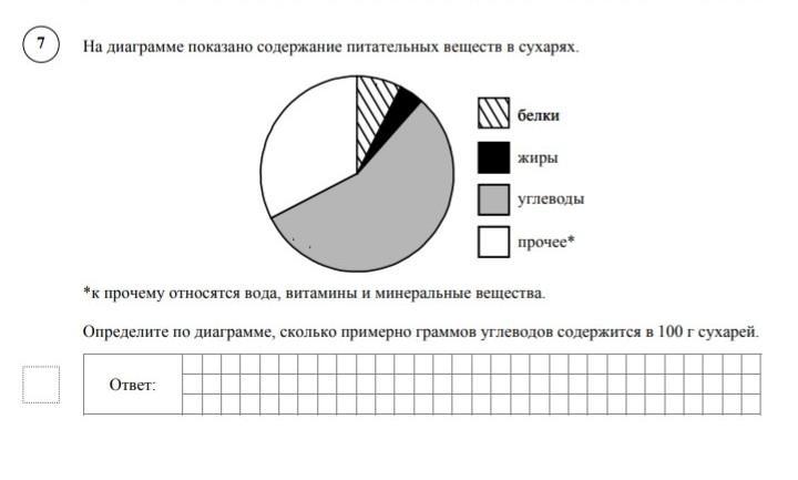 100г это 100% соответственно. Если разделить круг пополам, начиная где углеводы начинаются, получится половина круга, серая, то есть это углеводы 50% уже будут, + ещё небольшая часть остаётся, делим оставшуюся половину на 5 примерно равных частей, каждая из которых составит 10%, так как пол круга 50%. И примерно там 8-12% остаётся на углеводы и + 50% получится 58-62%, так как 100г это 100%, то 58-62% это 58-62г))