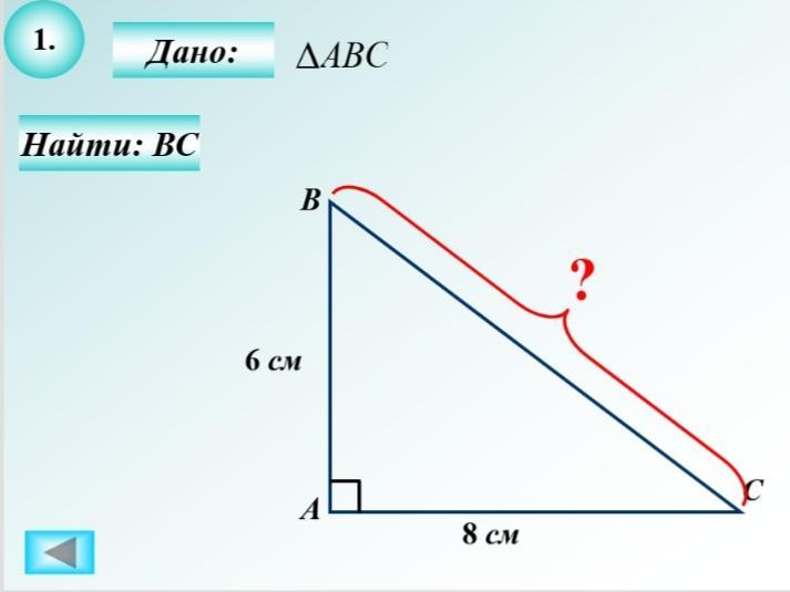 BC= √AB^2+AC^2= √6^2+8^2= √36+64= √100=10(по теореме Пифагора)