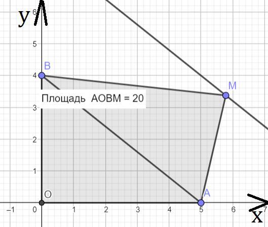 На координатной плоскости отмечены точки O(0;0), A(5;0), B(0;4). Прямая y=kx+b такова, что для любой точки M на этой прямой площадь AOBM равна 20. Чему равно k?