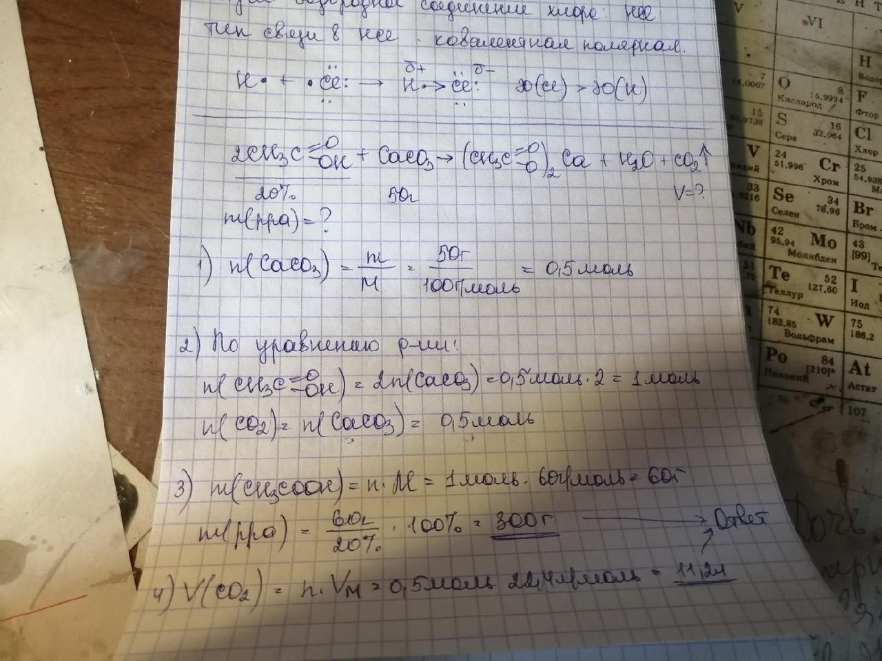 Обчисли масу розчину етанової кислоти з масовою часткою розчиненої речовини 20%, яка прореагує з 50г кальцій карбонату. Який об'єм газу утвориться?