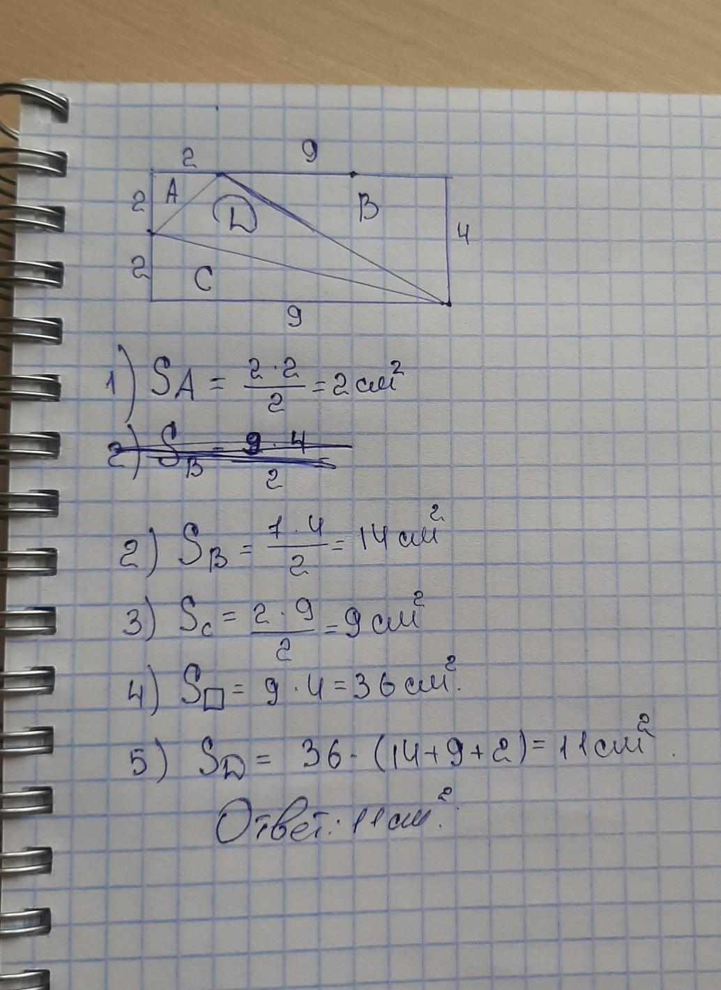 Нужно достроить треугольник до прямоугольника. Потом найти площади получившихся треугольников и самого прямоугольника.