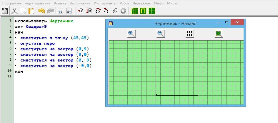Составить алгоритм управления Чертёжником, в результате которого на координатной плоскости будет нарисован квадрат, длина стороны которого равна 9 единицам.