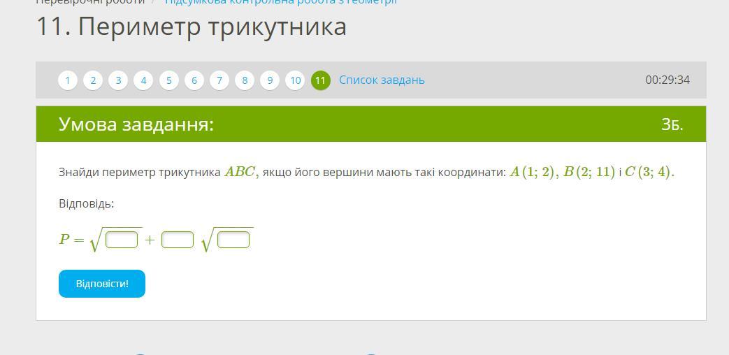 Знайди периметр трикутника ABC, якщо його вершини мають такі координати: A(1;2), B(2;11) і C(3;4).Помогите!!!!!))