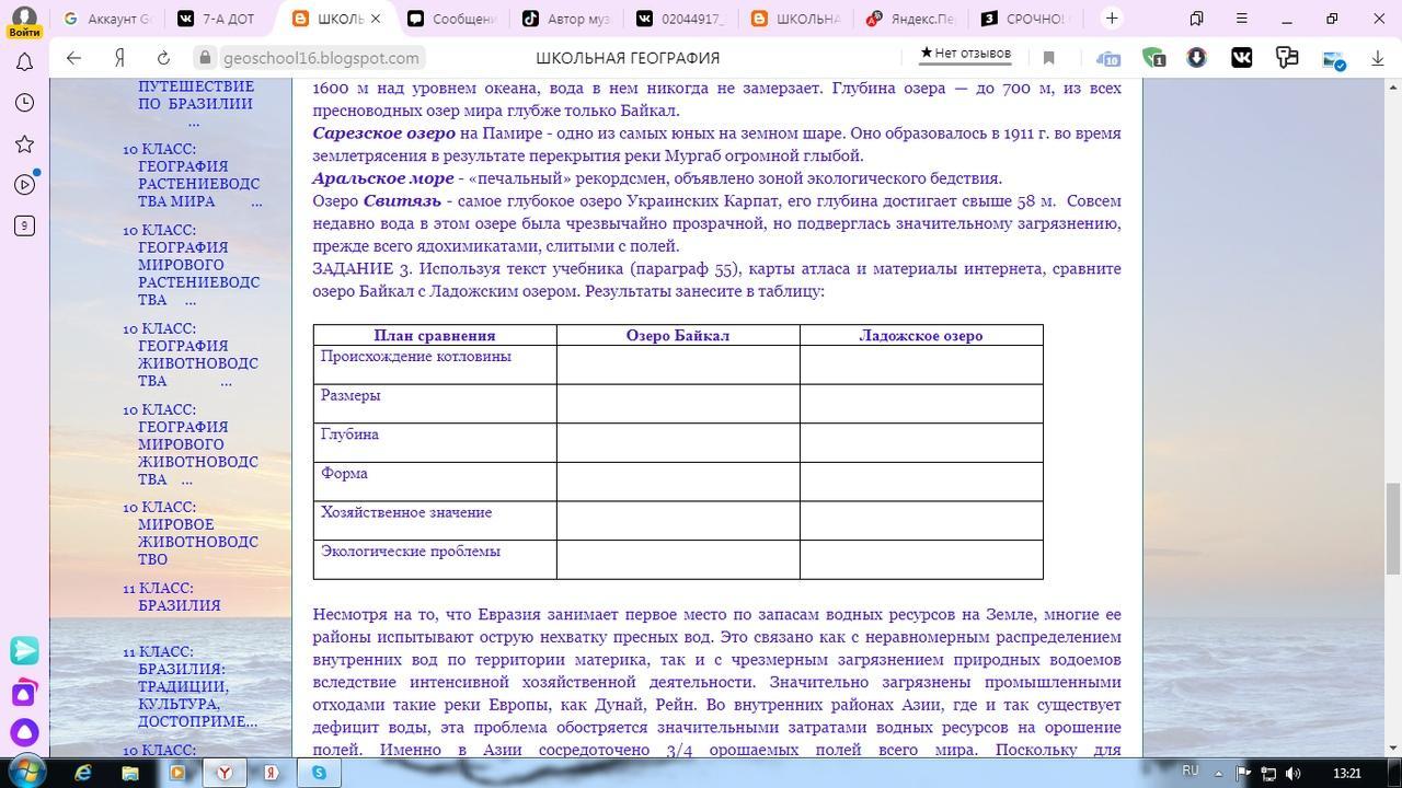 СРОЧНО! ГЕОГРАФИЯ! Используя текст учебника (параграф 55), карты атласа и материалы интернета, сравните озеро Байкал с Ладожским озером. Результаты занесите в таблицу: