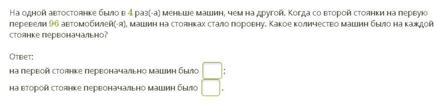 Ответ: 64 машины было на первой стоянке, 256 машин на второй стоянке