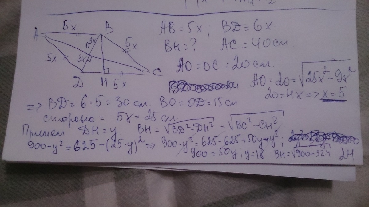 Примем сторона 5х, меньшая диагональ d=6x. Половина диагонали 3х является катетом прямоугольного треугольника, гипотенуза (сторона ромба) 5х. Найдем второй катет =корень из (25х^2-9х^2)=корень из 16х^2=4х. Второй катет равный 4х это половина второй диагонали. Значит вторая диагональ равна 8х и равна 40. Х=5, значит сторона =15, малая диагональ=30