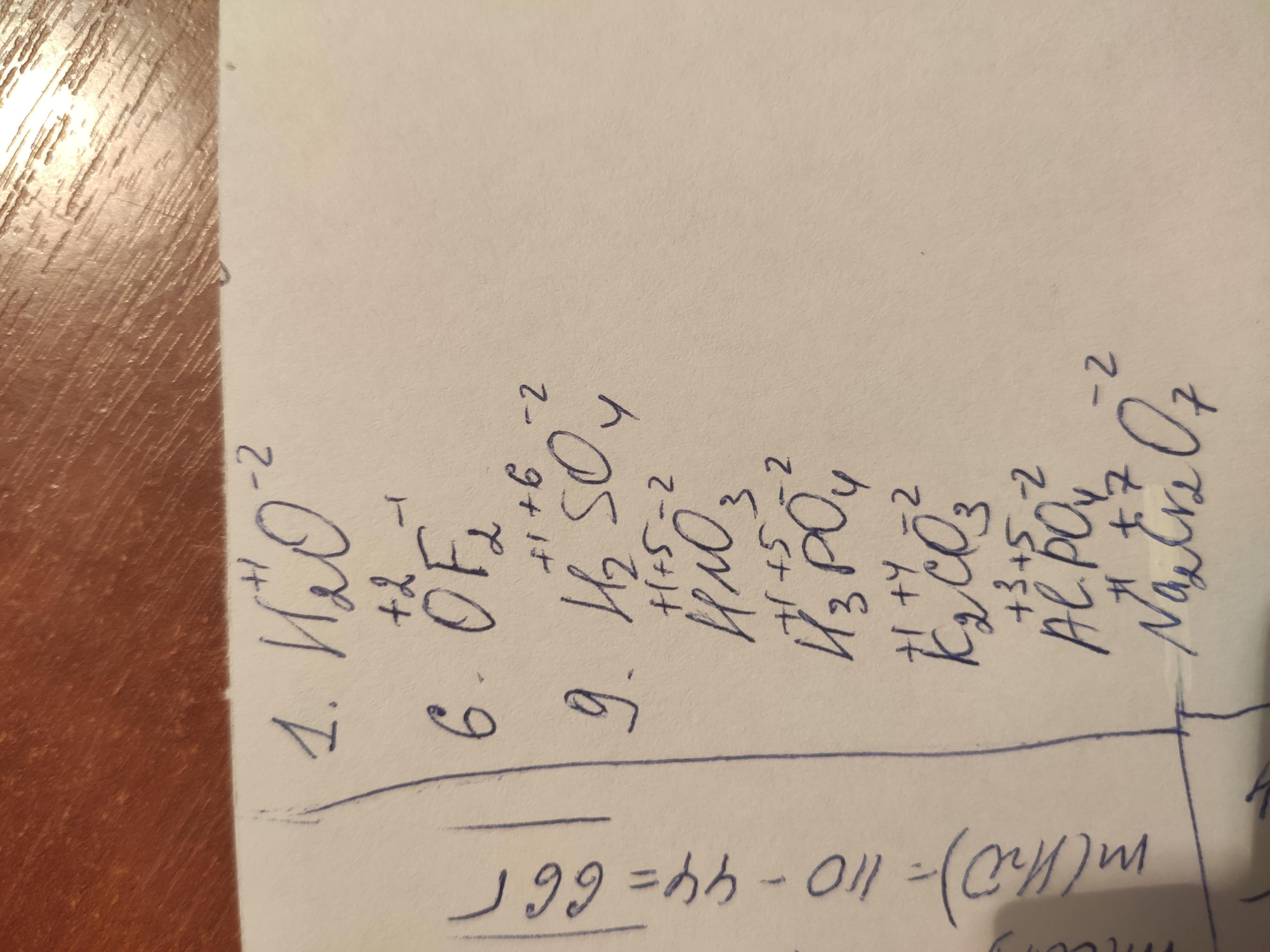 1 Яка ступінь окиснення ( далі СО ) елементів у воді? 2 Як змінюється електронегативність елементів у періоді та групі? 3 Чому дорівнює сумарна СО атомів всих елементів у молекул? 4 Чому дорівнює СО атомів у простих речовинах?5 Яку СО мають метали елементів першої, другої , третьої груп? 6 Визначте СО оксигена у сполуці OF2.7 Чому дорівнює максимальна СО елемента?8 Як обчислити мінімальну СО елемента? 9 Визначте СО елементів у сполуках : сульфатна кислота, нітратна кислота,фосфатна кислота, калій карбонат, алюміній фосфат, натрій біхромат.