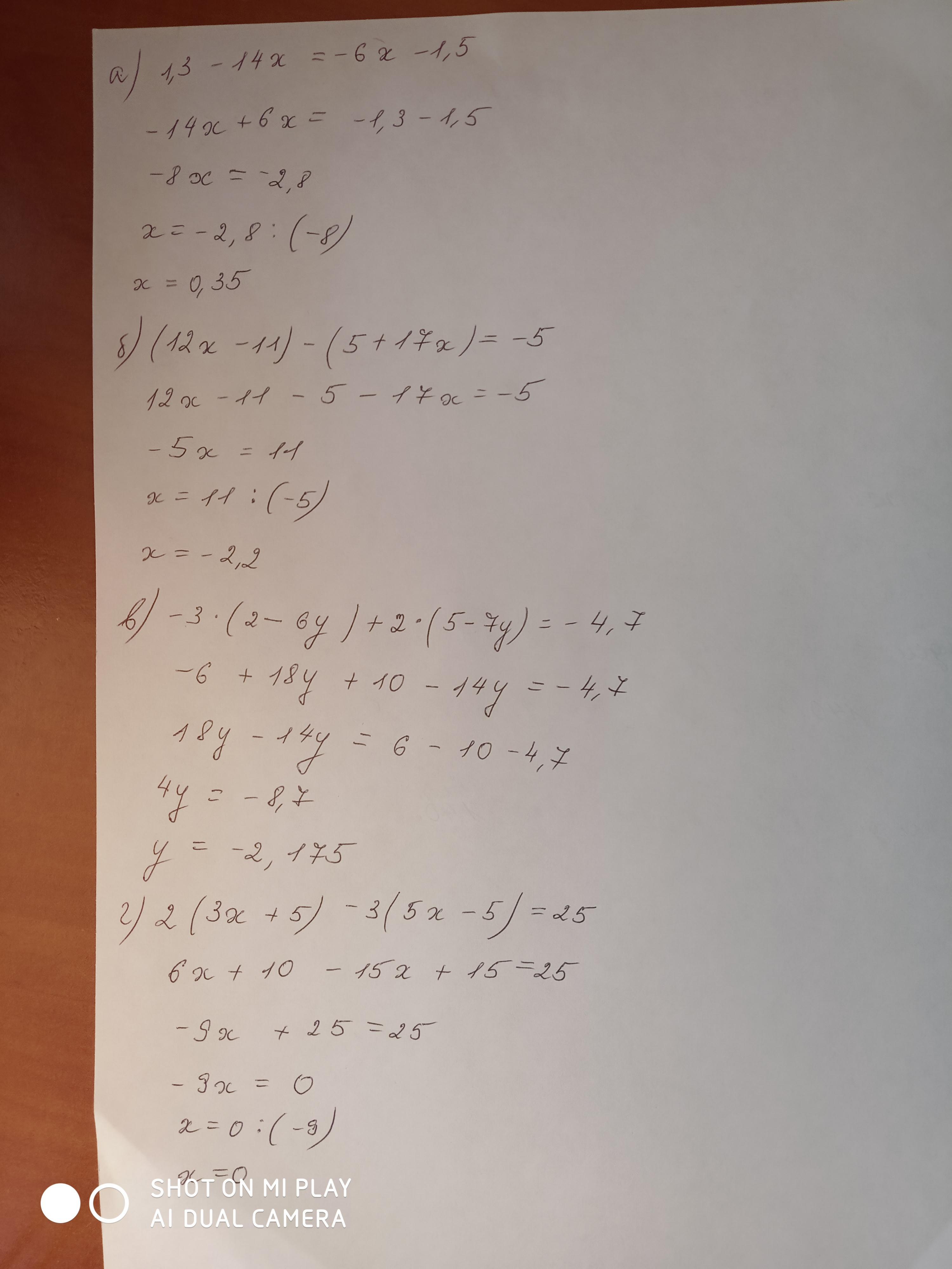 ) 1,3 − 14х = − 6х − 1,5 б)( 12х − 11) −( 5 + 17х) = − 5