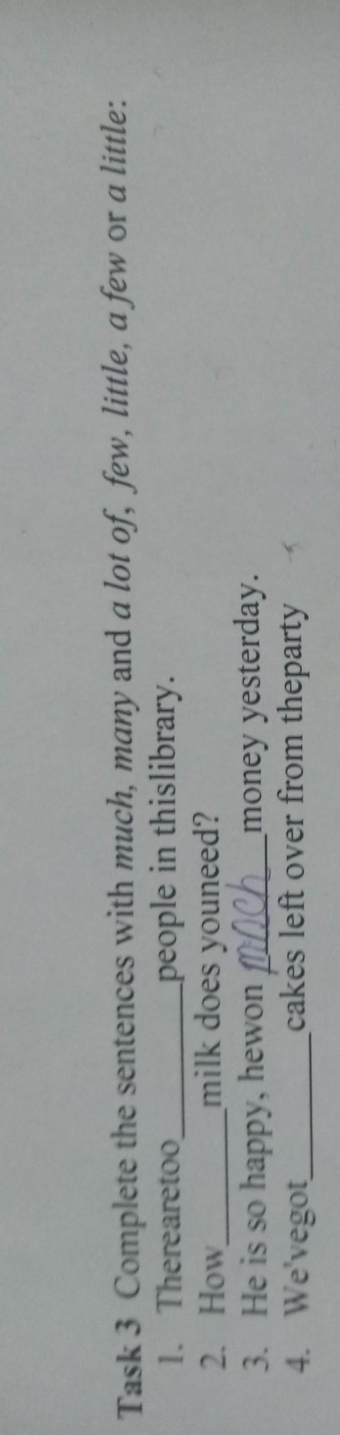 Task 3 Complete the sentences with much, many and a lot of, ſew, little, a few or a little: