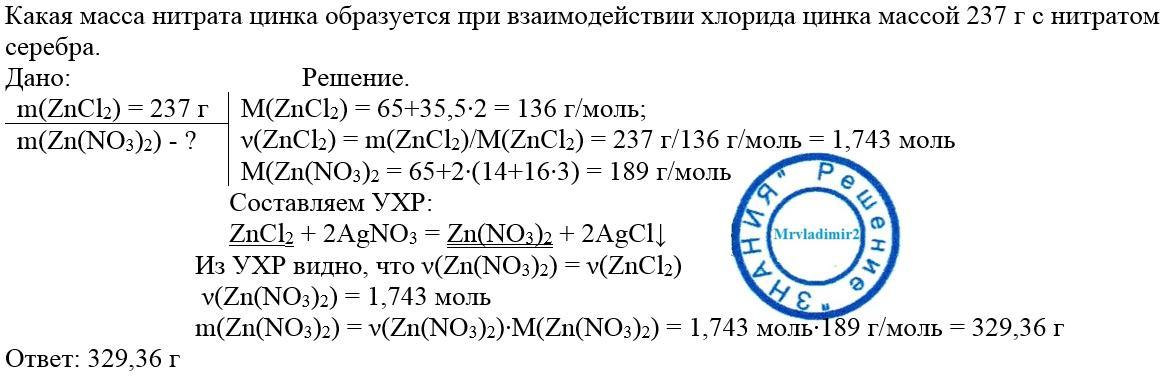Какая масса нитрата цинка образуется при взаимодействовии хлорида цинка массой 237 г с нитратом серебра. Прошу это срочно, с коротким объяснением, спасибо!