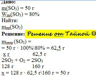 Вычислите массу оксида серы(IV), который потребуется для окисления кислородом, чтобы получить оксид серы (VI) массой 50г. Выход продукта реакции принять равным 80% от теоретически возможного.