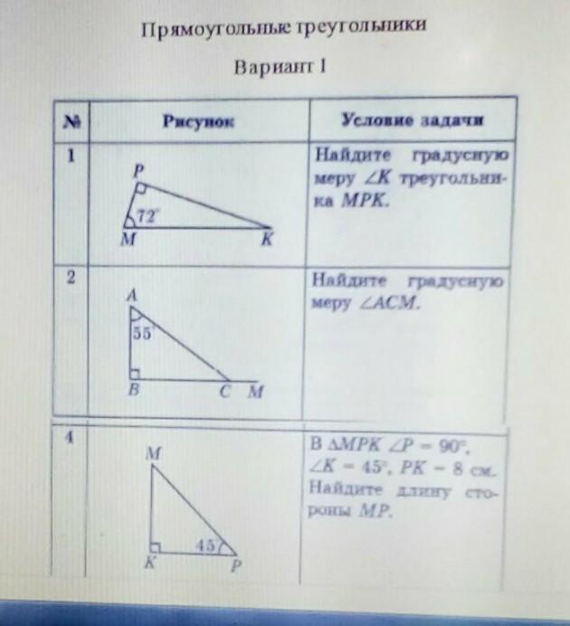 3) условие не сходится с задачей, так что если по рисунку, то углы м=р, т.к. их сумма 90, значит мк=кр=8 см, решаем по теореме Пифагора, получается, что мр= корень из 128.