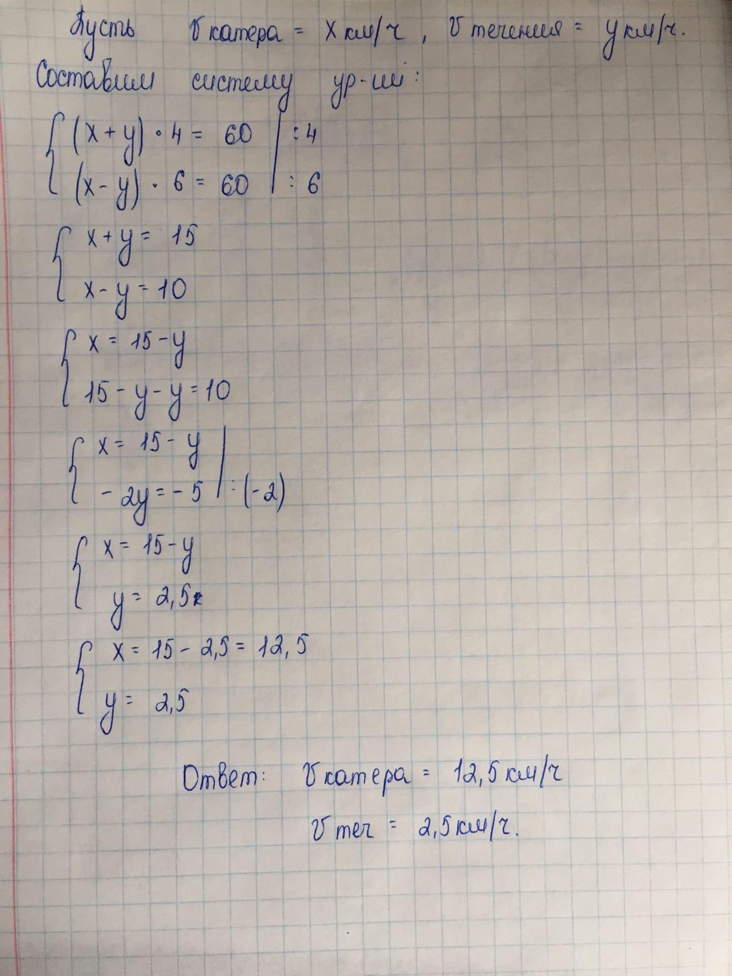 (15+10)/2=12.5 км/ч - скорость катера