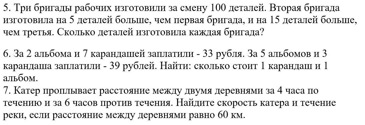 5) Пусть первая бригада изготовила X деталей, тогда вторая бригада изготовила (X+5) деталей, а третья (х+5)-15 деталей. Составим уравнение: