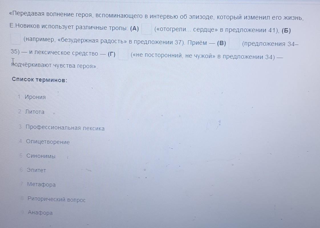 «Передавая волнение героя, вспоминающего в интервью об эпизоде, который изменил его жизнь, автор использует различные тропы: метафора («отогреть сердце» — это метафора, то есть перенос признаков одного предмета на другой на основании их сходства), эпитет («безудержная» — образное определение, то есть эпитет). Приём — анафора (предложения 34 и 35 начинаются одинаково: «Выходит, что...») — и лексическое средство — синонимы («посторонний» и «чужой» — синонимы) — подчёркивают чувства героя».