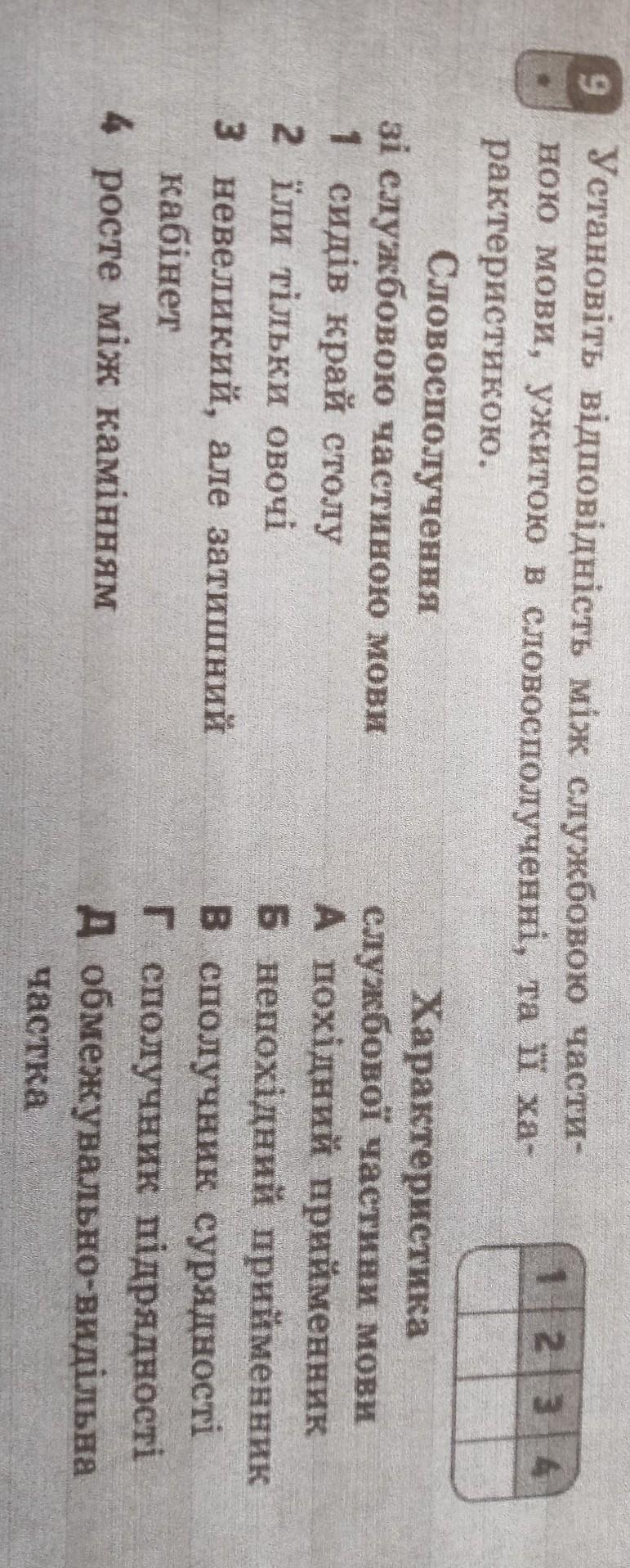 Установіть відповідність між службовою частиною мови ужитою в словосполученні, та її характеристикою. Поможіть будь ласка