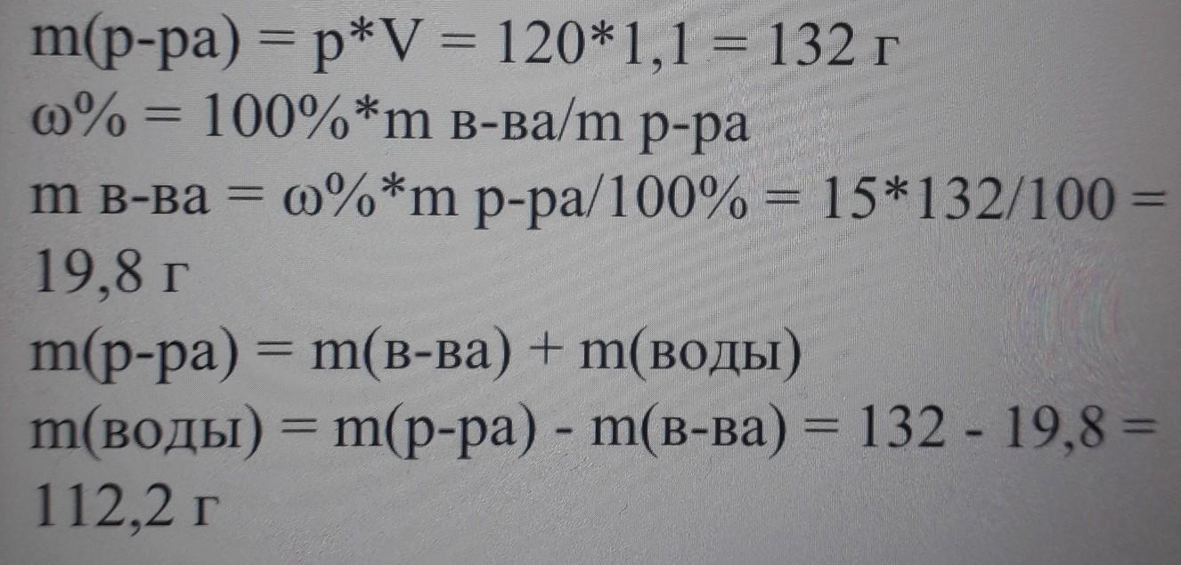 Определите массу соли и массу воды, которые необходимы для приготовления раствора объемом 120 мл и плотностью 1,1 г / мл. с массовой долей соли 15%.