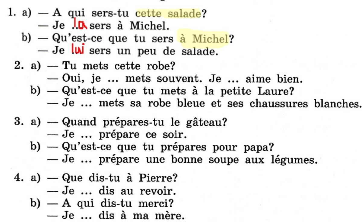 2. a) Oui, Je la mets souvent. Je l"aime bien; б) Je la mets sa robe bleue et ses chaussures blanches.