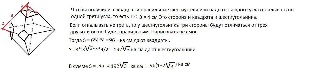 У октаэдра откололи все вершины так, что получилась фигура, у которой 6 граней — квадраты, а 8 граней — правильные шестиугольники. Рассчитай площадь поверхности этой фигуры, если длина ребра данного октаэдра — 12 ед.