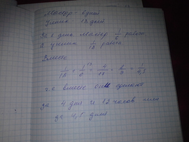 Мастер и ученик работают над заказом. Мастеру необходимо 6 дней, чтобы выполнить заказ самостоятельно, а ученику на эту же работу понадобится 18 дней. За сколько дней будет выполнен заказ, при условии совместной работы мастера и ученика