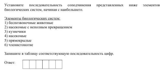 В условии задания требуется расположить элементы, начиная с наибольшего. Начинаем с беспозвоночных животных (1). Членистоногие - это тип. Тип членистоногие(6) включает три класса, одним из которых является класс насекомые(4). Есть насекомые с полным превращением, а есть с неполным превращением(2). Здесь необходимо знать, какие именно отряды насекомых относятся к насекомым с неполным превращением. К насекомым с полным превращением относятся отряды: жесткокрылые, перепончатокрылые, двукрылые, чешуекрылые и блохи. Методом исключения определяем, что прямокрылые(5) относятся к насекомым с неполным превращением. Представителем отряда прямокрылые является кузнечик(3).