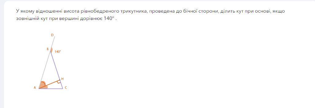 У якому відношенні висота рівнобедреного трикутника, проведена до бічної сторони, ділить кут при основі, якщо зовнішній кут при вершині дорівнює 140° .