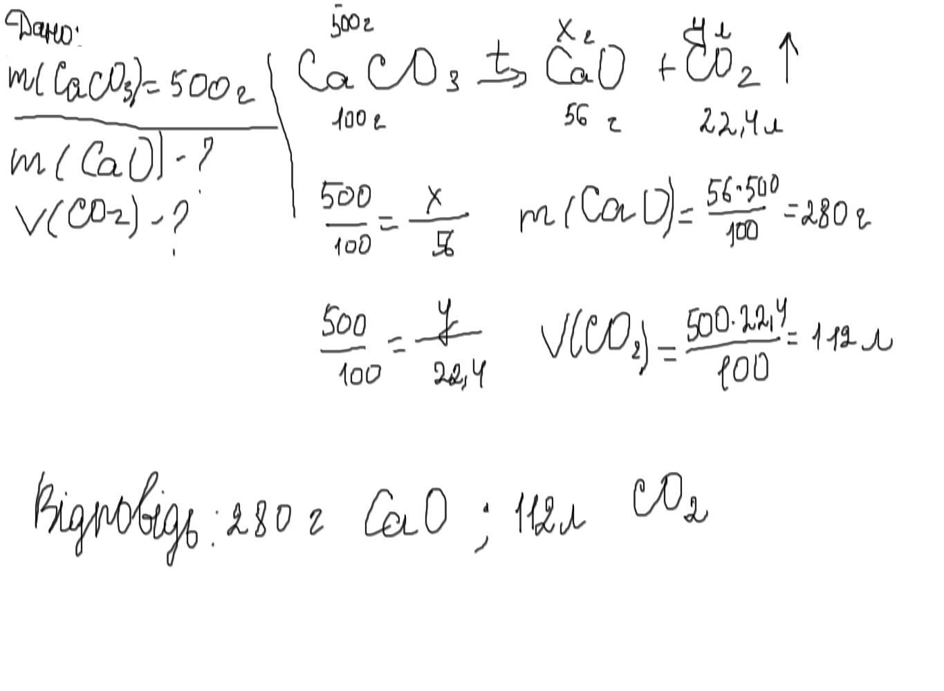 Вапняк масою 500г нагріли до припинення реакції. обчисліть масу негашеного вапна і об'єм вуглекислого газу які утворилися при цьому.